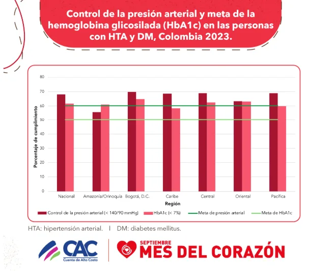 Durante el periodo 2023, se observó un desempeño favorable en los indicadores de control de la tensión arterial y de la meta de la hemoglobina glicosilada en la mayoría de las regiones. La única excepción fue la Amazonía/Orinoquía, que presentó un cumplimiento medio en el control de tensión arterial, lo que sugiere la necesidad de implementar intervenciones que aumenten este control.