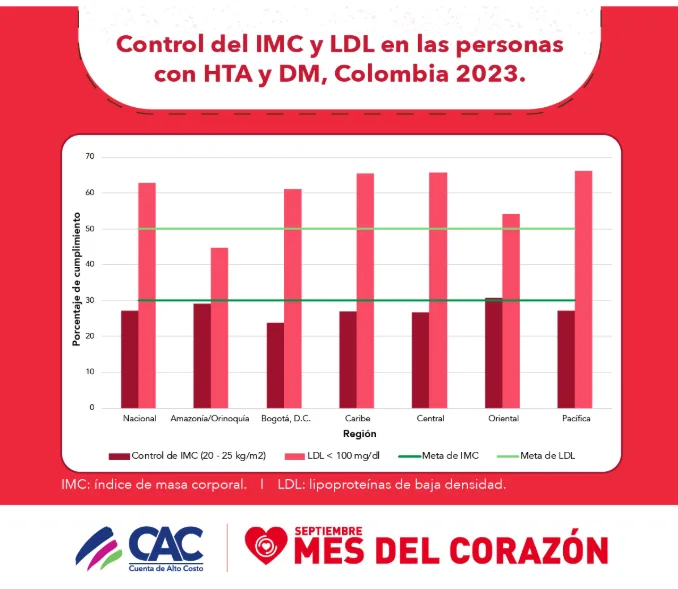 La CAC realiza el seguimiento de las personas con hipertensión arterial (HTA) y diabetes mellitus (DM) en el marco del aseguramiento y evalúa la gestión de esta población. Como parte de esta estimación, se toma en cuenta el control de los factores de riesgo cardiovascular, como el índice de masa corporal (IMC), la tensión arterial, la hemoglobina glicosilada y el colesterol LDL.
