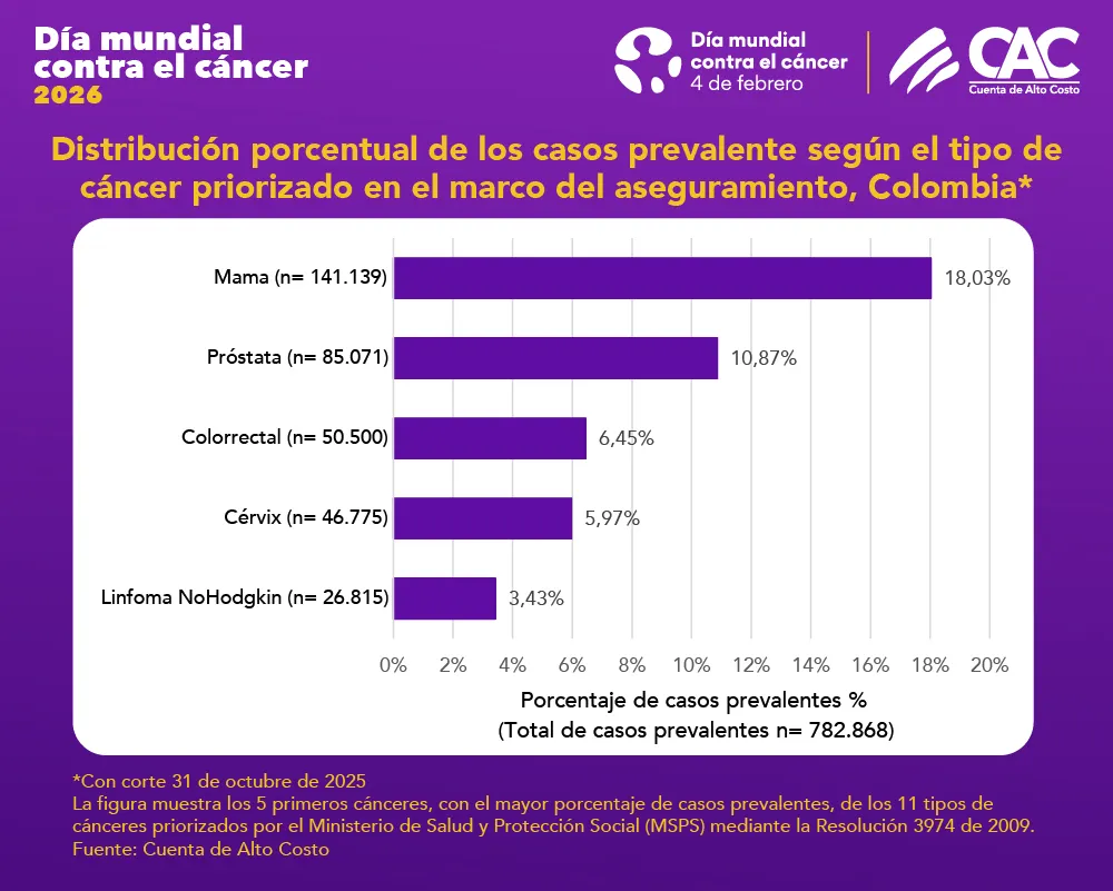 En este marco, la CAC presenta la información actualizad con corte al 31 de octubre de 2025: en Colombia, 782.868 casos de cáncer registraron atenciones en el marco del aseguramiento. Entre las neoplasias priorizadas por el Ministerio de Salud y Protección Social, los mayores porcentajes corresponden añ cáncer de mama (18,03%), próstata (10,87%) y colorrectal (6,45%).