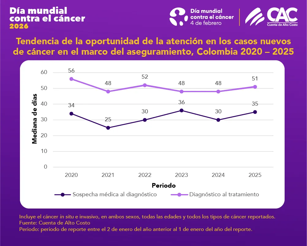 En los casos nuevos del periodo 2025 (definido entre el 2 de enero de 2024 y el 1 de enero de 2025), la CAC reportó una mediana de 35 días desde la sospecha médica hasta la confirmación diagnóstica y una mediana de 51 días desde el diagnóstico hasta el inicio del primer tratamiento (cirugía, terapias sistémicas o radioterapia).