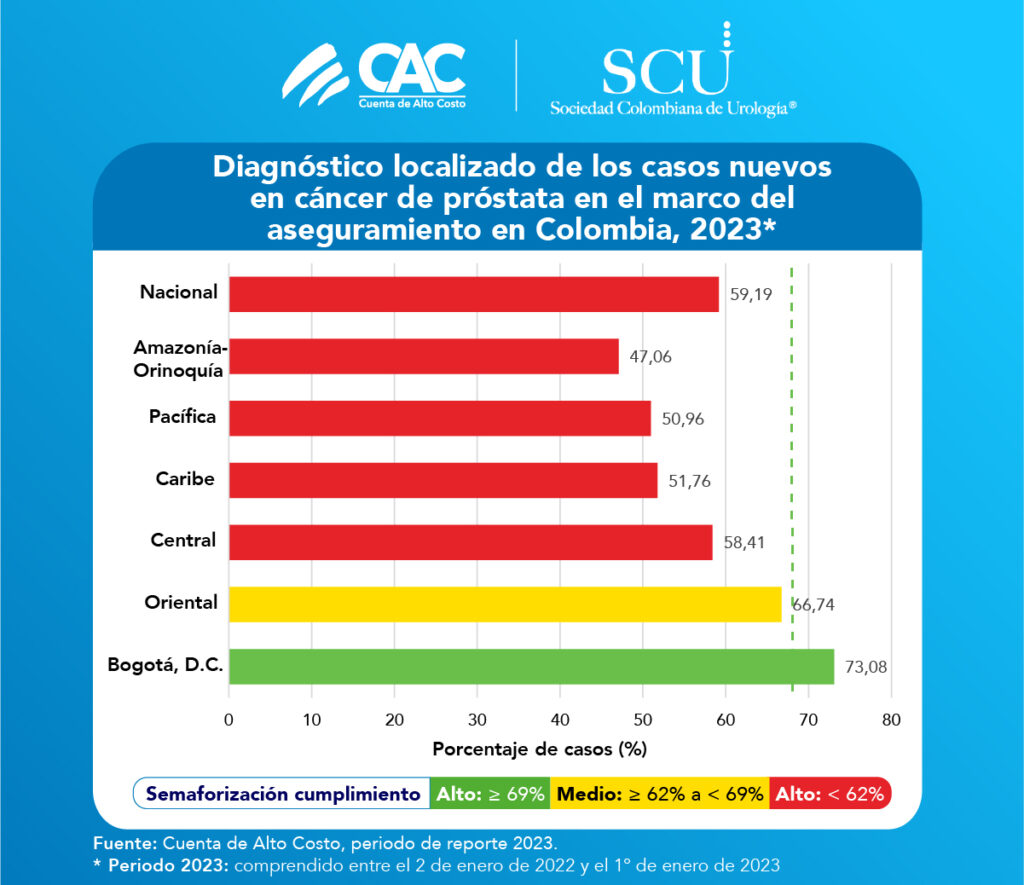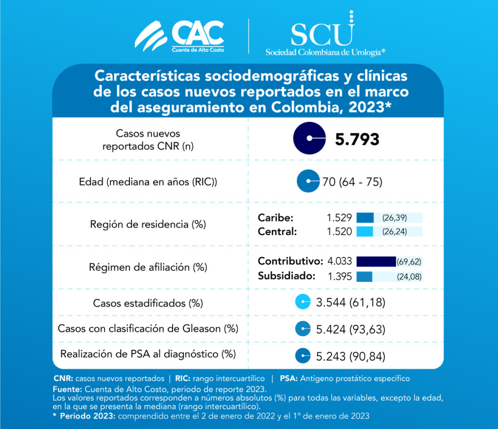 En Colombia, el cáncer de próstata es la neoplasia más frecuente en entre los hombres. Durante el periodo comprendido entre el 2 de enero de 2022 y el 1º de enero de 2023, se reportaron a la Cuenta de Alto Costo (CAC) 5.793 casos nuevos con este tumor, representando el 9,85% del total de los casos de cáncer diagnosticados durante ese periodo.