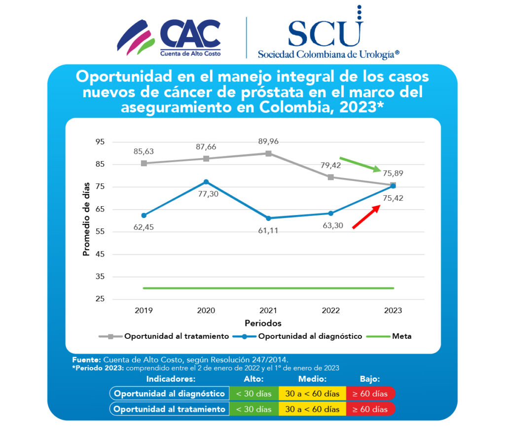 En cuanto a la atención oportuna de los hombres con este diagnóstico, se ha observado en los dos últimos periodos una reducción en el tiempo desde la confirmación del diagnóstico hasta el inicio del primer tratamiento (quimioterapia, radioterapia o cirugía). A pesar de esta tendencia, el resultado sigue siendo superior a los 30 días definidos como meta para este indicador.