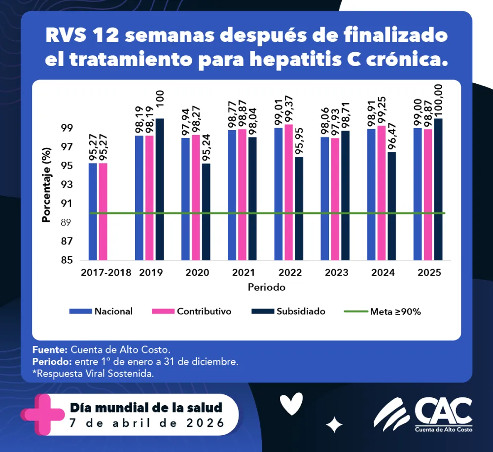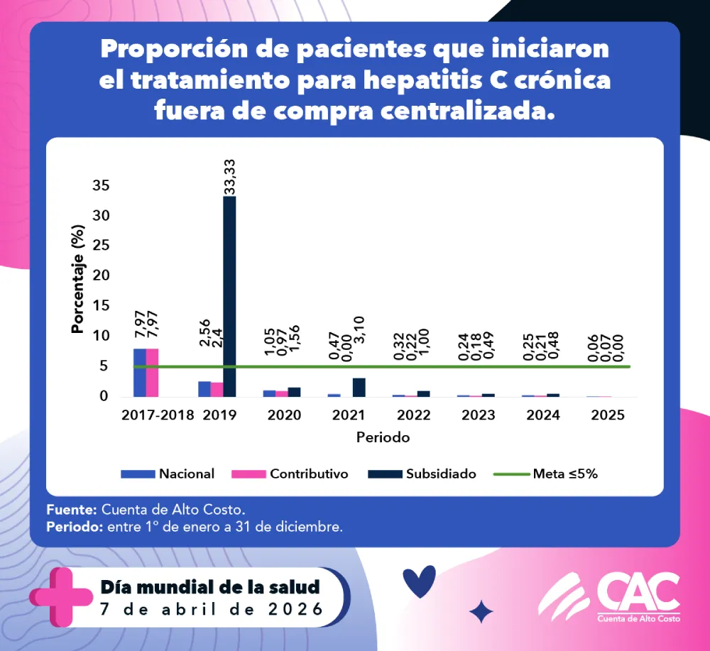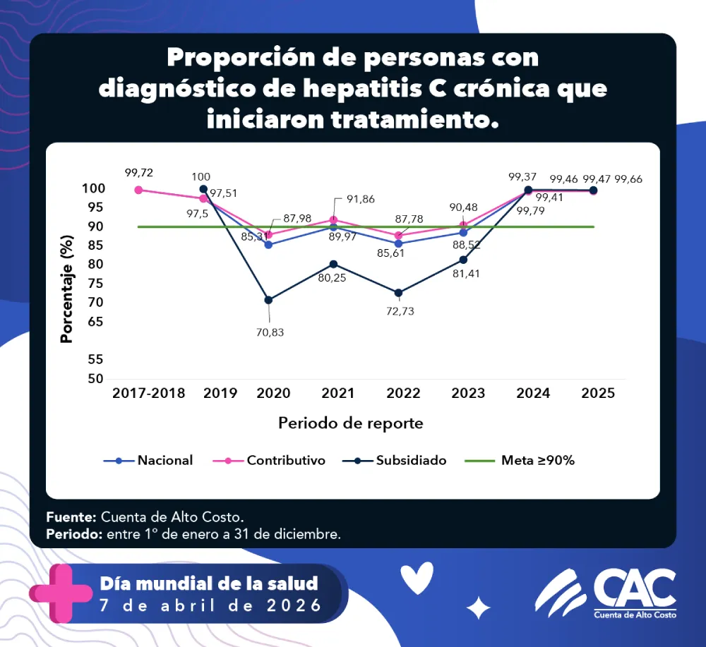 Un caso representativo es el de la hepatitis C, donde el seguimiento a esta cohorte ha permitido evaluar el impacto de estrategias como la compra centralizada de medicamentos. Por ejemplo, el acceso al tratamiento con antivirales de acción directa en el régimen subsidiado pasó del 70,83 % en 2020 al 99,66 % en 2025.