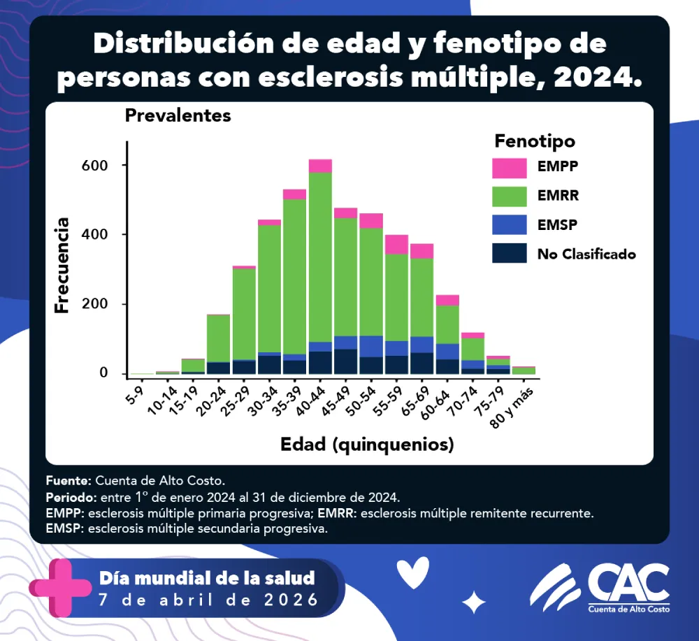 En el caso de la esclerosis múltiple, la información reportada contribuye a caracterizar su comportamiento en el país y a aportar insumos para la toma de decisiones en política y planificación. En el periodo 2024, la mediana de la edad de los casos prevalentes fue de 45 años (RIC: 35 – 56), con predominio de la forma remitente recurrente, seguida de la primaria progresiva.