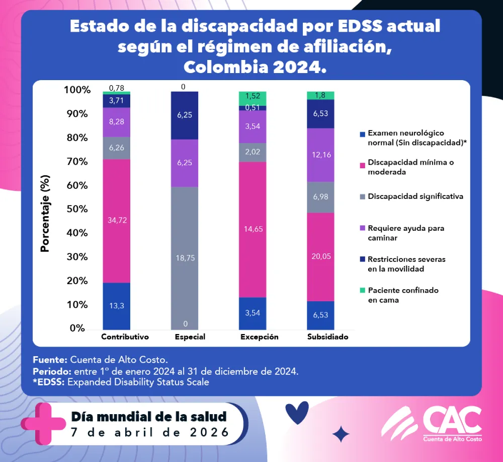 Por otro lado, esta es una enfermedad que puede generar diferentes grados de discapacidad en las personas, independientemente de su régimen de afiliación. Los análisis muestran variaciones en la distribución de estas categorías entre regímenes; por ejemplo, en las categorías de Restricciones severas en la movilidad y Paciente confinado en cama se encuentran el 8,33 % de las personas con EM del subsidiado y el 4,49 % del contributivo. Esta situación evidencia la necesidad de intervenciones diferenciales que respondan a las condiciones y necesidades específicas de la población afectada.