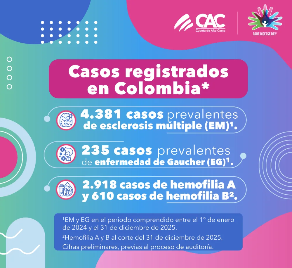 En el marco del día mundial de las enfermedades huérfanas, la Cuenta de Alto Costo (CAC) reafirma su compromiso con la generación y consolidación de información actualizada sobre la situación de estas enfermedades en Colombia. Así, a través del análisis de la epidemiología, la morbilidad, la mortalidad y el acceso a la atención integral, la CAC contribuye al fortalecimiento de la toma de decisiones en el sistema de salud y al mejoramiento continuo de la calidad de la atención de las personas que viven con estas condiciones.