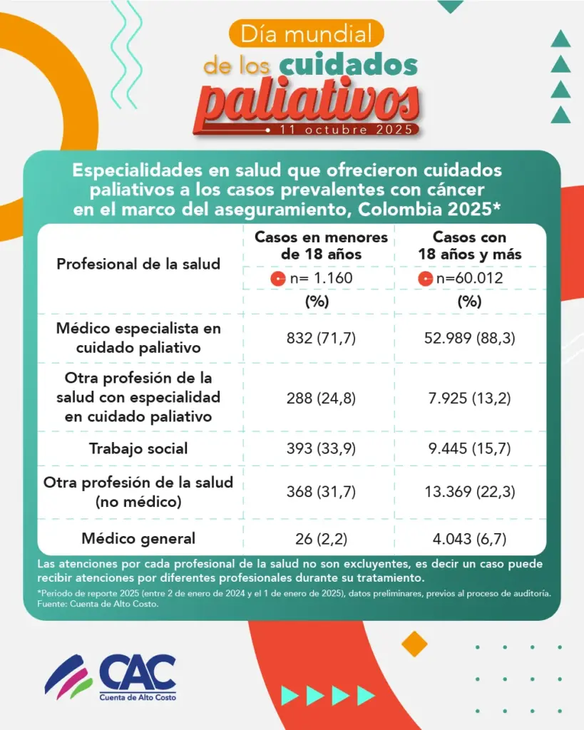 En 2025, más de la mitad de las atenciones en cuidados paliativos fueron realizadas por médicos especialistas en esta área, lo que refleja un avance en la disponibilidad de talento humano capacitado para esta atención. Estos resultados resaltan la importancia de seguir fortaleciendo la cobertura y promuevan la integración de los cuidados paliativos en los planes de manejo de los pacientes.