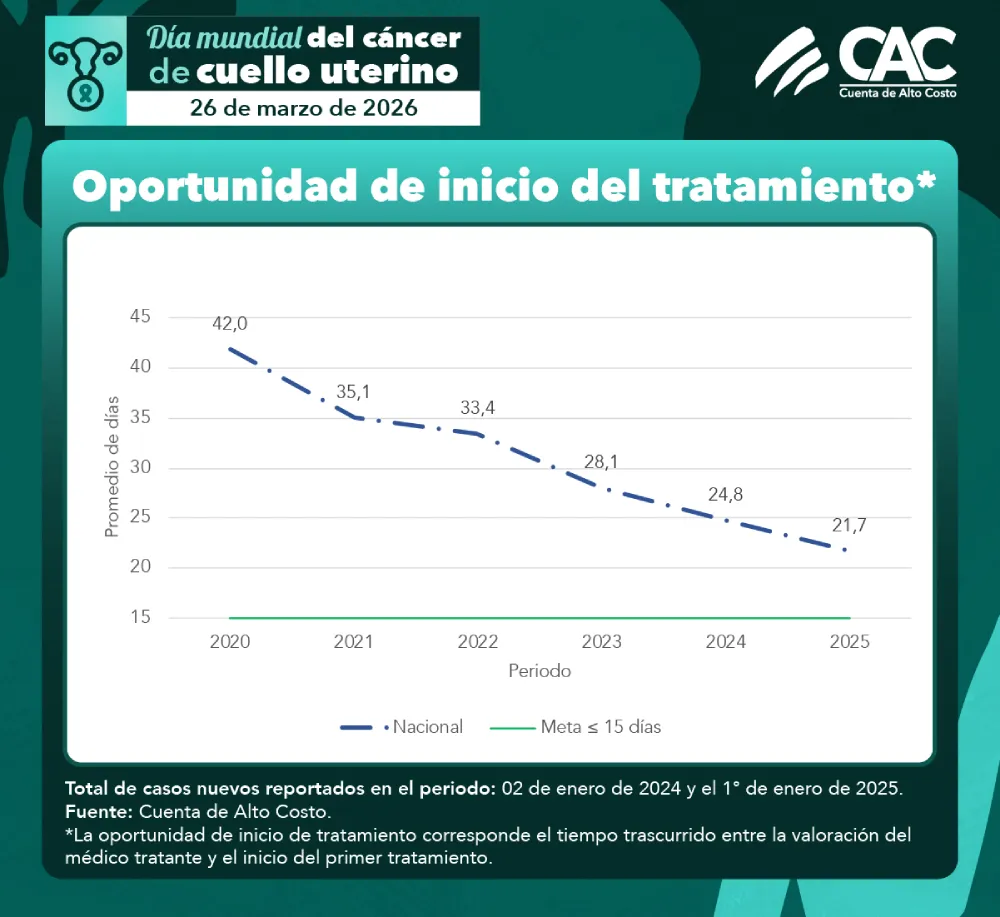 El tiempo transcurrido entre la valoración por el médico tratante y el inicio del tratamiento es un factor determinante para la supervivencia de las pacientes. En el país, el tiempo promedio para iniciar el tratamiento fue de 22 días, lo que representa una disminución frente al periodo anterior. Este indicador refleja avances en la coordinación de la atención dentro del sistema de salud; sin embargo, persisten desafíos territoriales que requieren intervenciones específicas para garantizar una atención oportuna y equitativa.