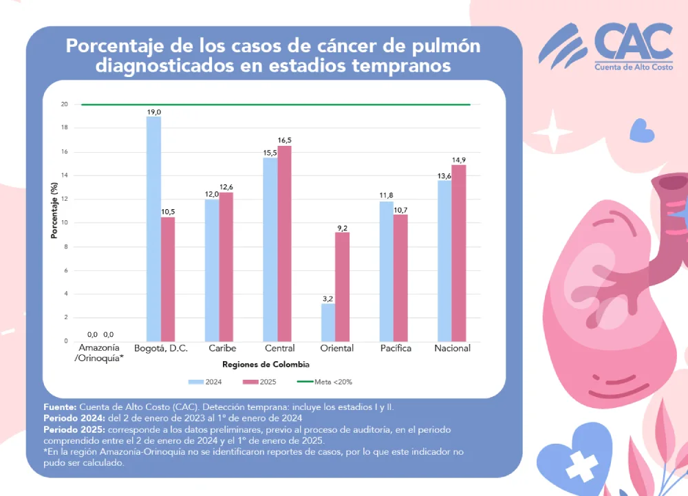 En el país, la proporción de las personas diagnosticadas en estadios tempranos de cáncer de pulmón aumentó en un 9,5% respecto al periodo anterior. Las regiones Caribe, Central y Oriental presentaron los mayores avances en detección temprana.