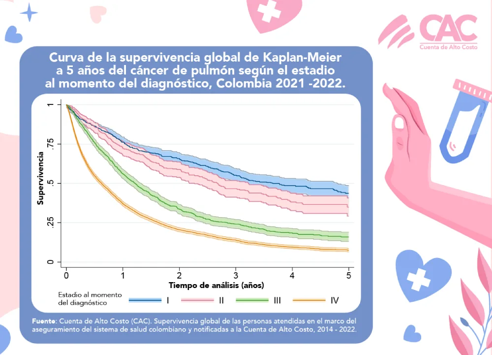 Según los resultados del Informe especial de supervivencia global de la Cuenta de Alto Costo (2025), la supervivencia global a cinco años en las personas con cáncer de pulmón en Colombia fue calculada en un 15,80% (2).