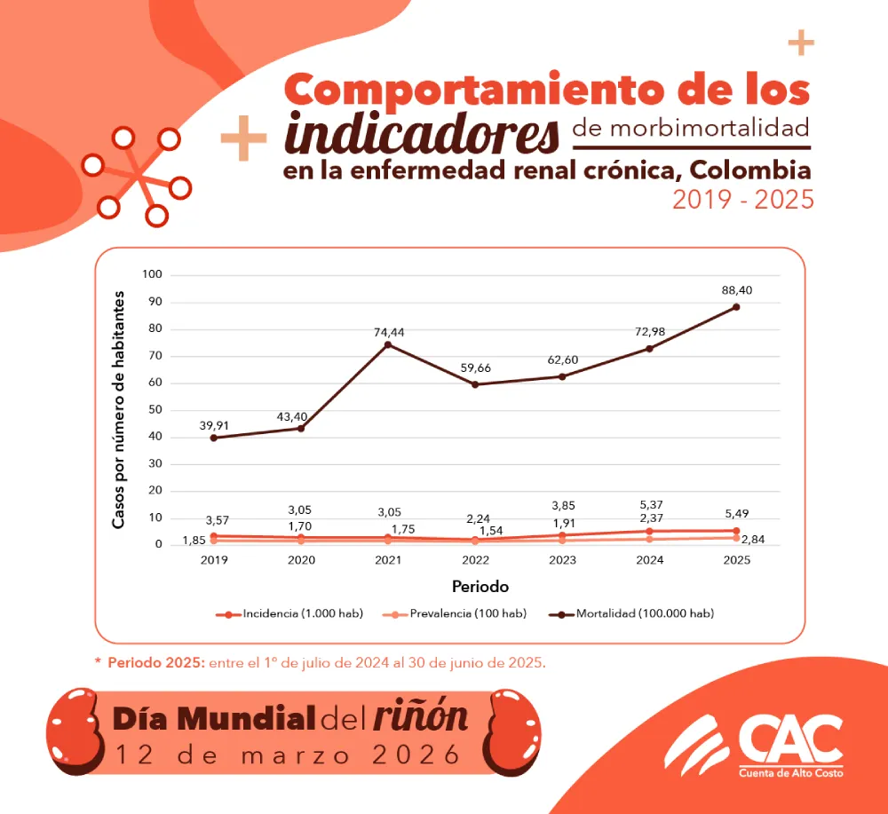 La Sociedad Internacional de Nefrología (ISN) y la Federación Internacional de Fundaciones Renales – Alianza Renal Mundial (IFKF-WKA) conmemoran el día mundial del riñón 2026 bajo el lema global “Salud renal para todos: cuidando a las personas, protegiendo el planeta”. La Cuenta de Alto Costo se une a esta iniciativa presentando avances en información, medición y analítica aplicada para la gestión de la enfermedad renal crónica en Colombia.