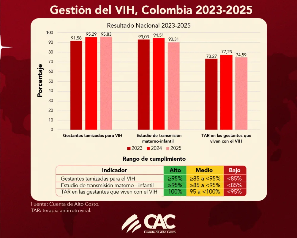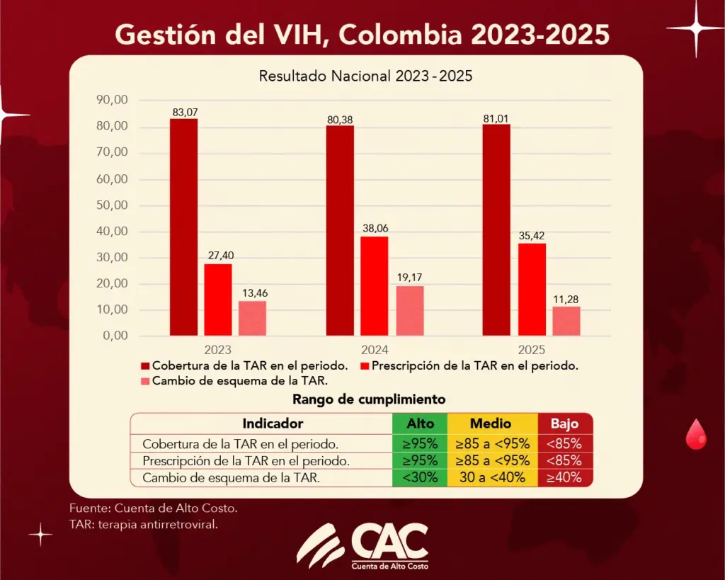En el marco de la conmemoración del día mundial de la lucha contra el Sida, la Cuenta de Alto Costo (CAC) presenta el balance actualizado de la gestión del VIH en Colombia. Bajo el lema de ONUSIDA “Superar las interrupciones, transformar la respuesta al sida”, el informe detalla el estado actual del diagnóstico, el tratamiento y la prevención en el país con corte al 31 de octubre de 2025. La conmemoración de este año reafirma el llamado a la acción urgente, al liderazgo político y a la cooperación internacional para proteger los avances, cerrar brechas y avanzar hacia el objetivo de poner fin al sida como amenaza para la salud pública en 2030 (1).